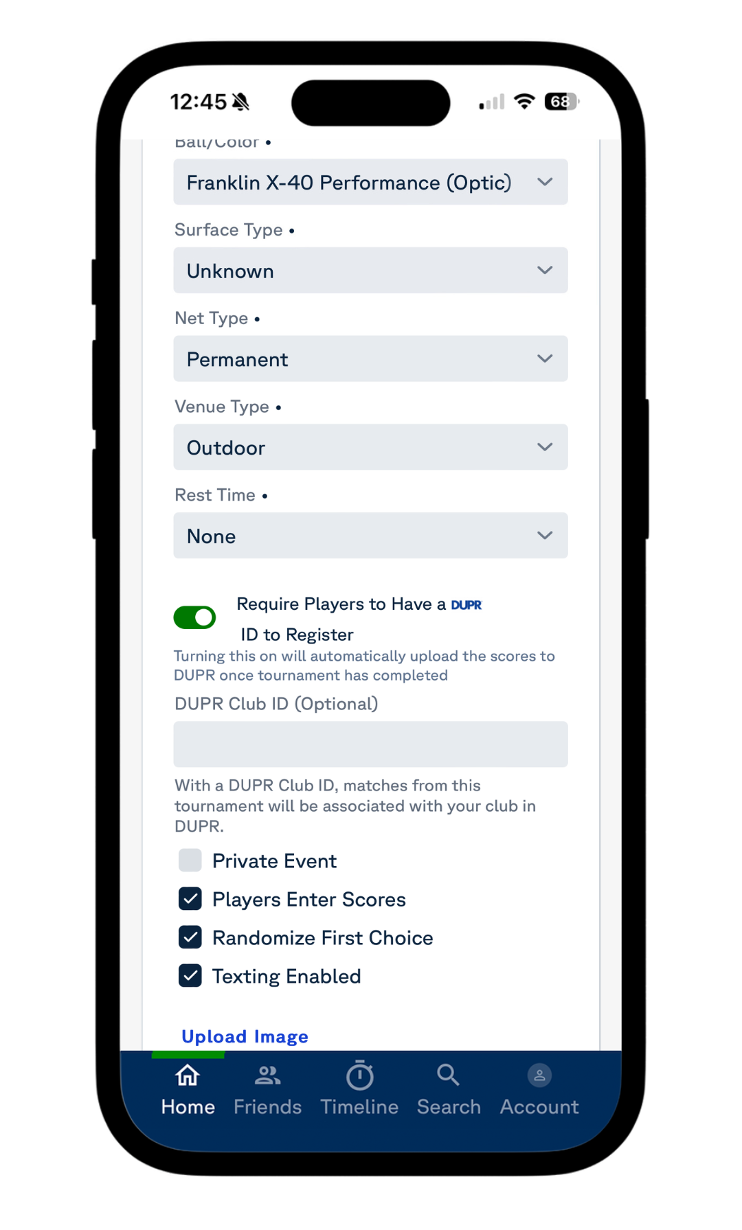 Pickleball Den tournament directors can host DUPR-enabled events, requiring players to link their DUPR as part of the registration process. Scores from DUPR-enabled events will automatically update player ratings, helping players understand their skill level, track progress, and find more playing opportunities.