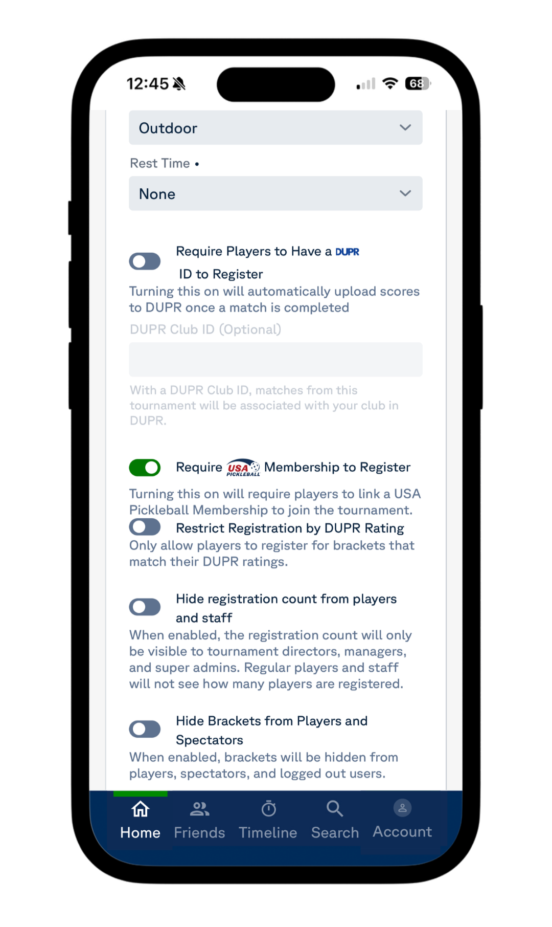 Pickleball Den tournament directors can require players to hold an active USA Pickleball membership as part of the registration process. When enabled, players will be prompted to provide their membership information during registration.